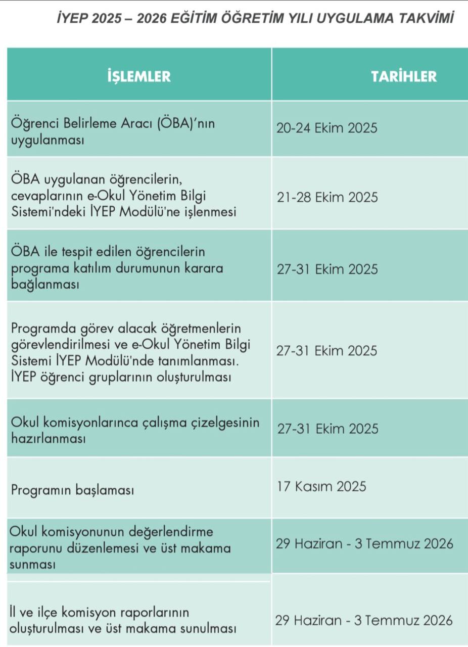 2025-2026 Eğitim Öğretim Yılı İYEP Uygulama Takvimi