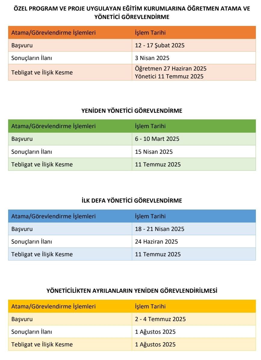 2025 Proje Okulları Öğretmen Atama - Yönetici Görevlendirme Takvimi