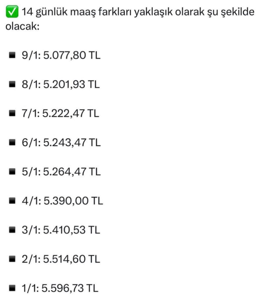 Kademelerinize göre 14 günlük maaş farkları aşağıdaki görselde paylaşılmıştır.