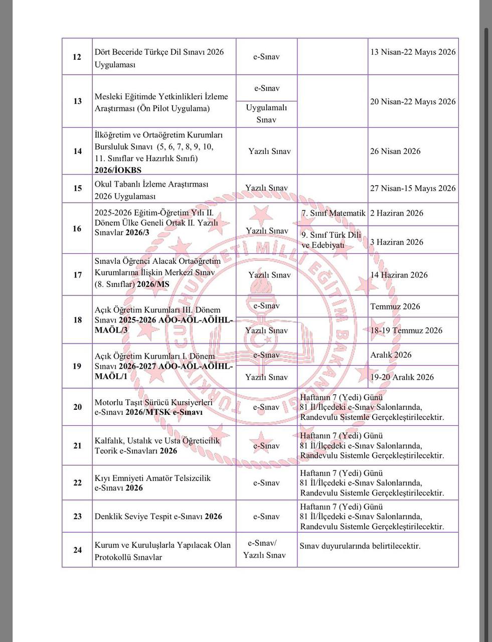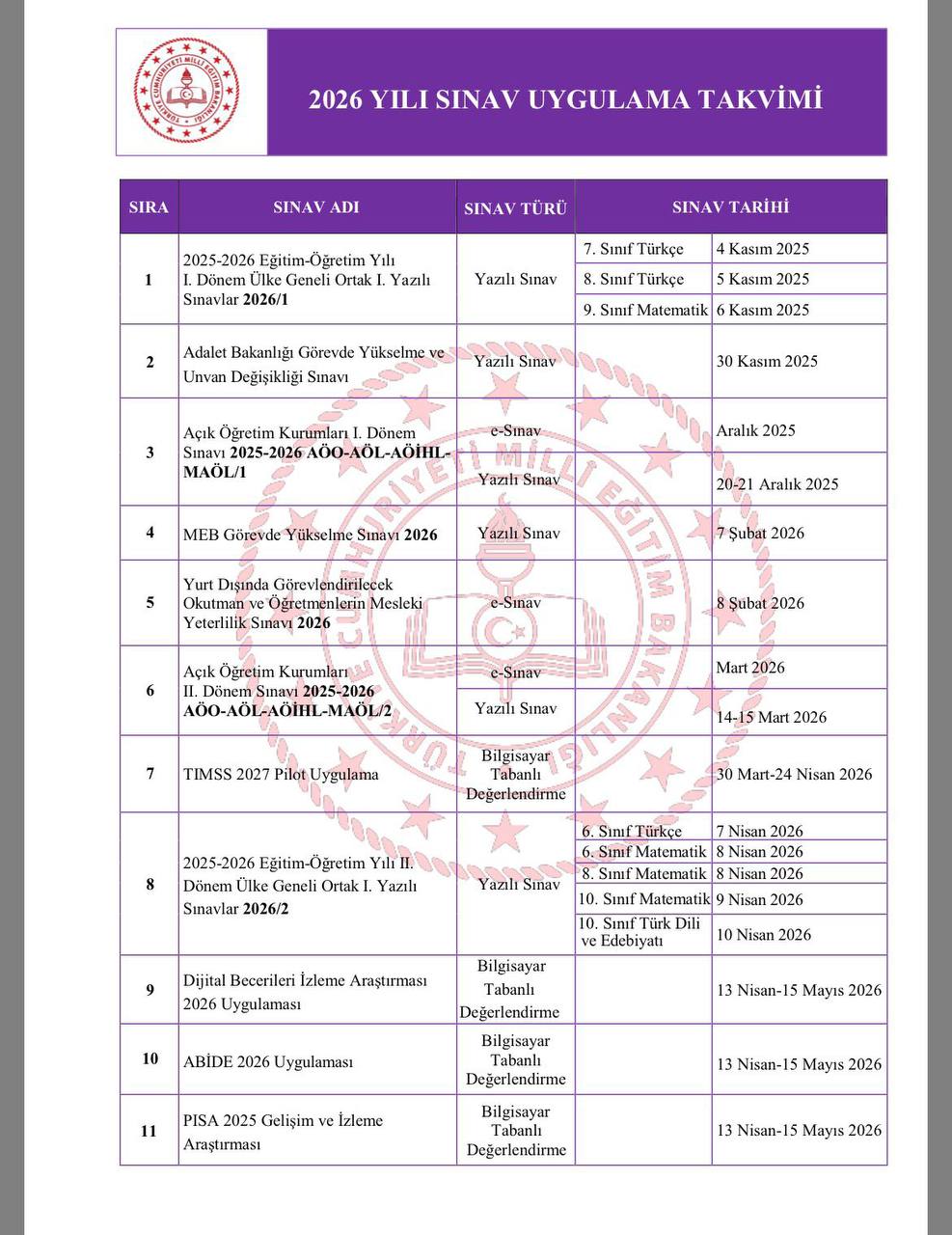 2026 Yılı MEB Sınav Uygulama Takvimi