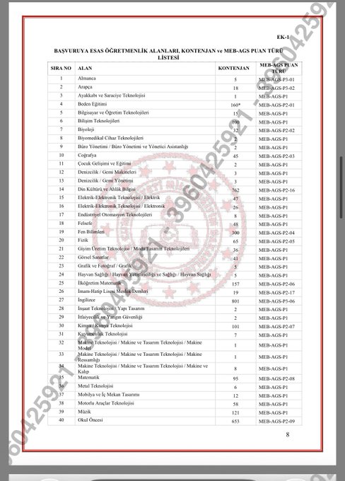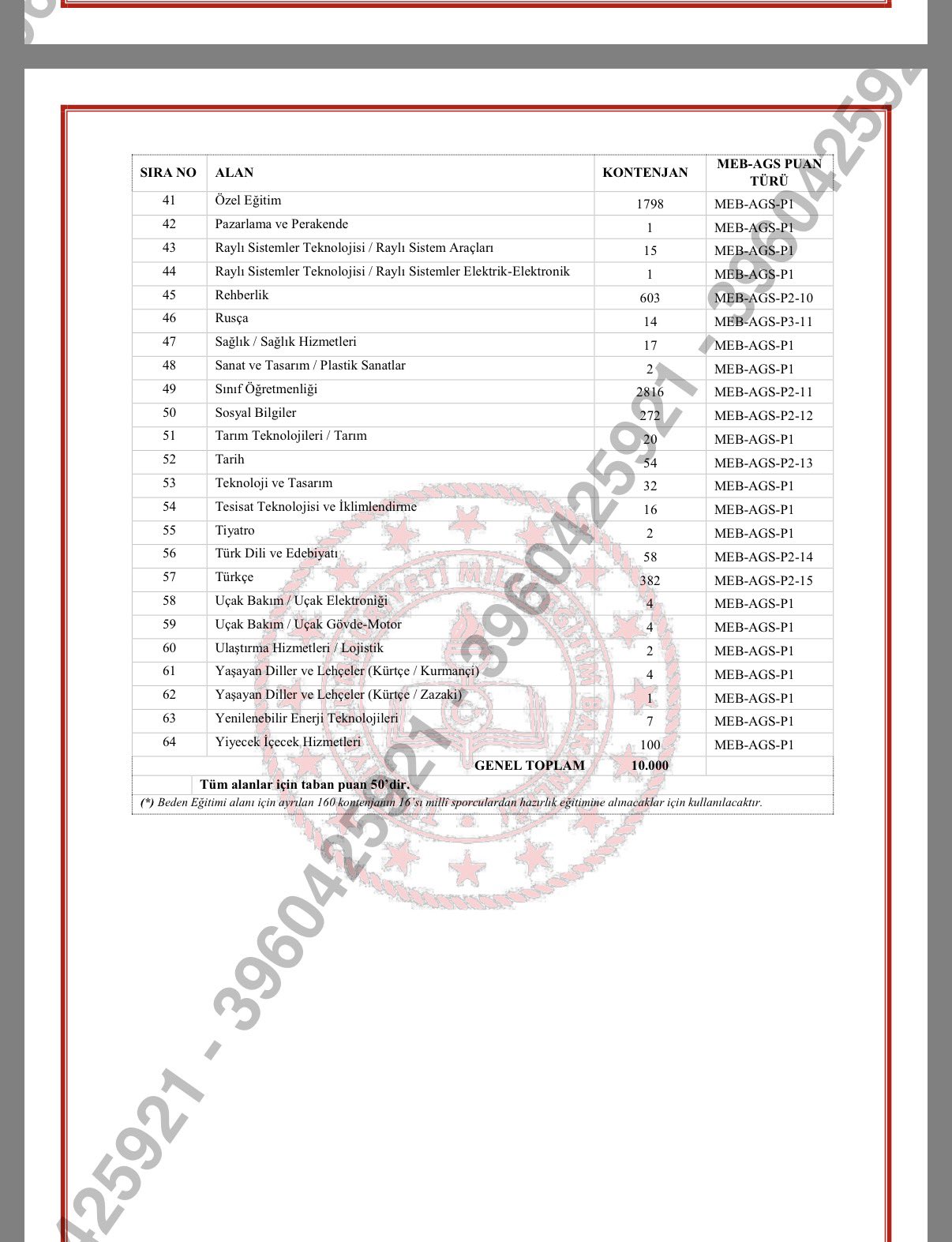 MEB AGS 2026 branşlara göre kontenjan dağılımı