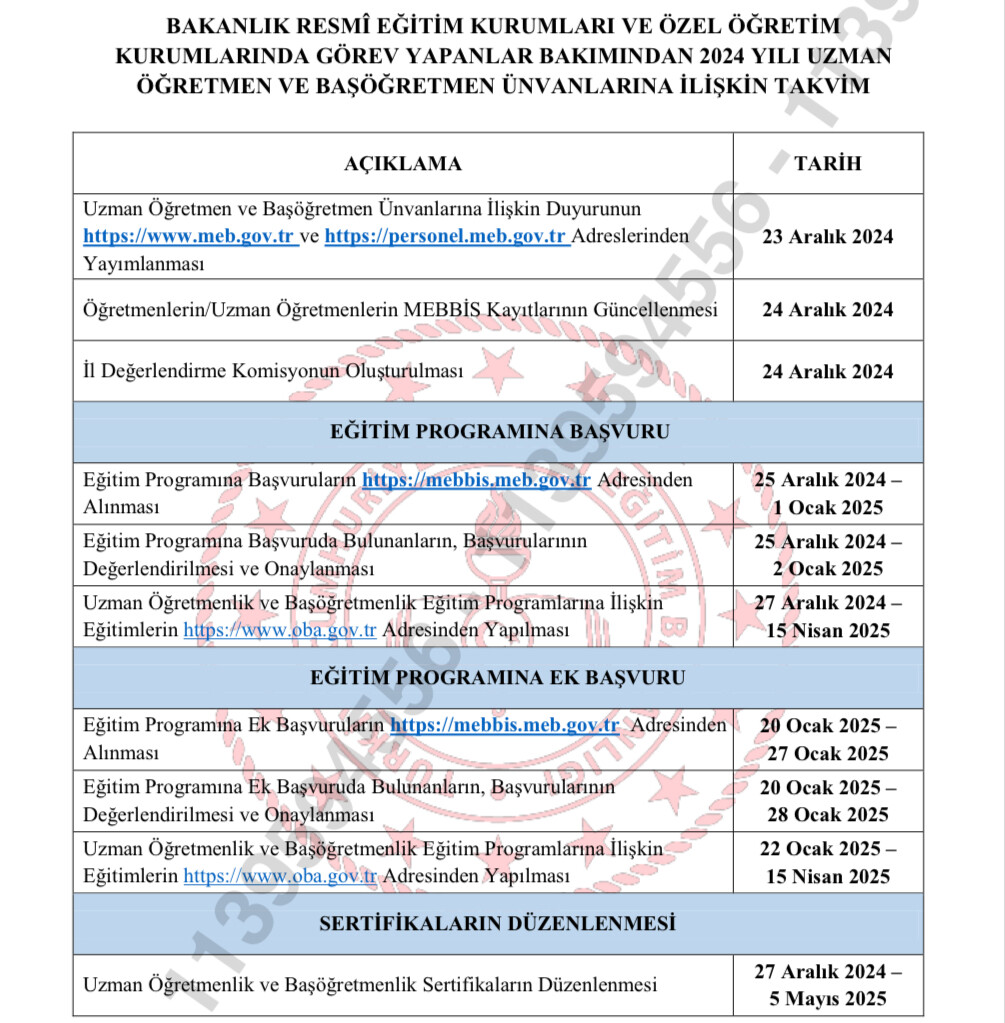 Uzman ve başöğretmenlik başvuru takvimi 2024-2025